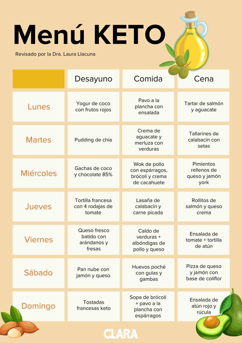 Menú semanal de la dieta keto gratis revisado por la Dra. Laura Llacuna, especialista en Psiconeuroinmunología y Nutrición.